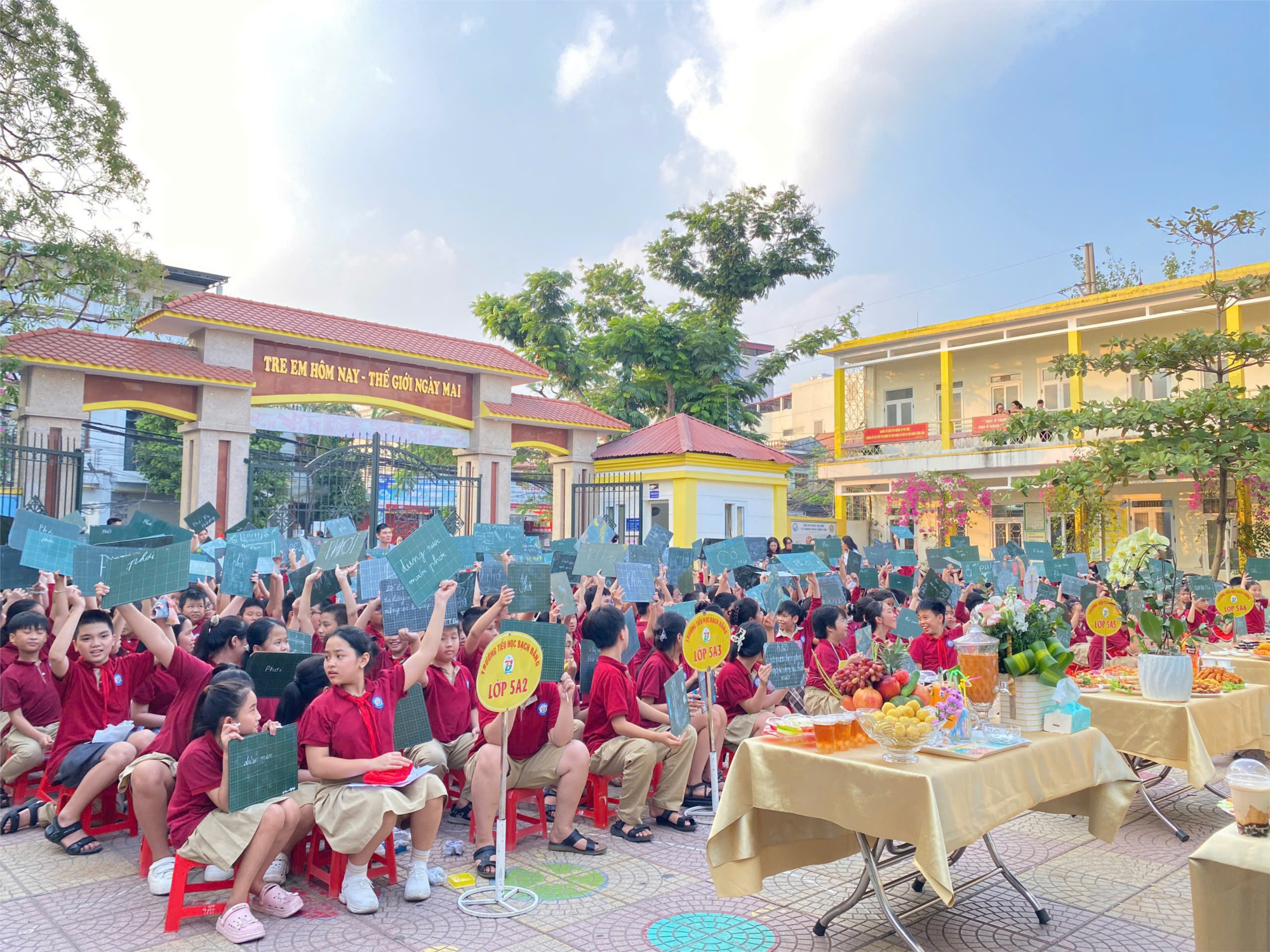 Sau phần thuyết trình về các món ăn của HS khối 5, HS toàn trường còn được tham gia trải nghiệm quản lí tài chính cá nhân thông qua việc mua bán các sản phẩm tại các gian hàng.