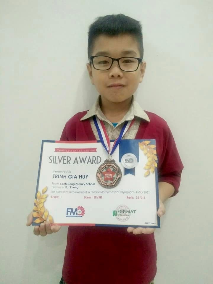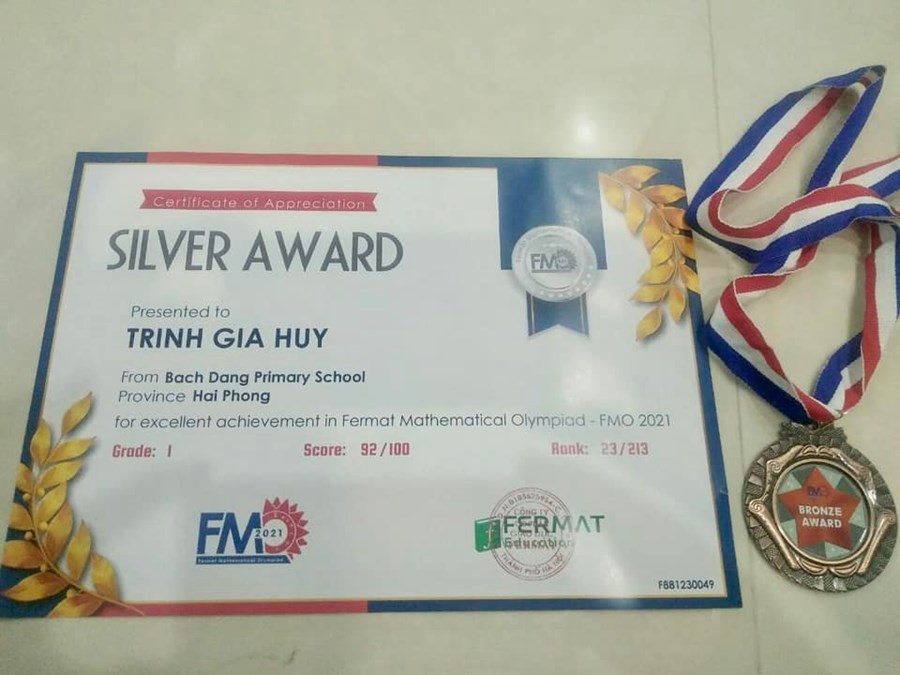 Nhờ nỗ lực của bản thân, dạy dỗ của thầy cô và gia đình, em Trịnh Gia Huy đã đạt Huy chương Bạc với số điểm 92/100 (Giải thưởng gia đình em mới nhận được khi Huy học lớp 2 năm học 2021-2022)