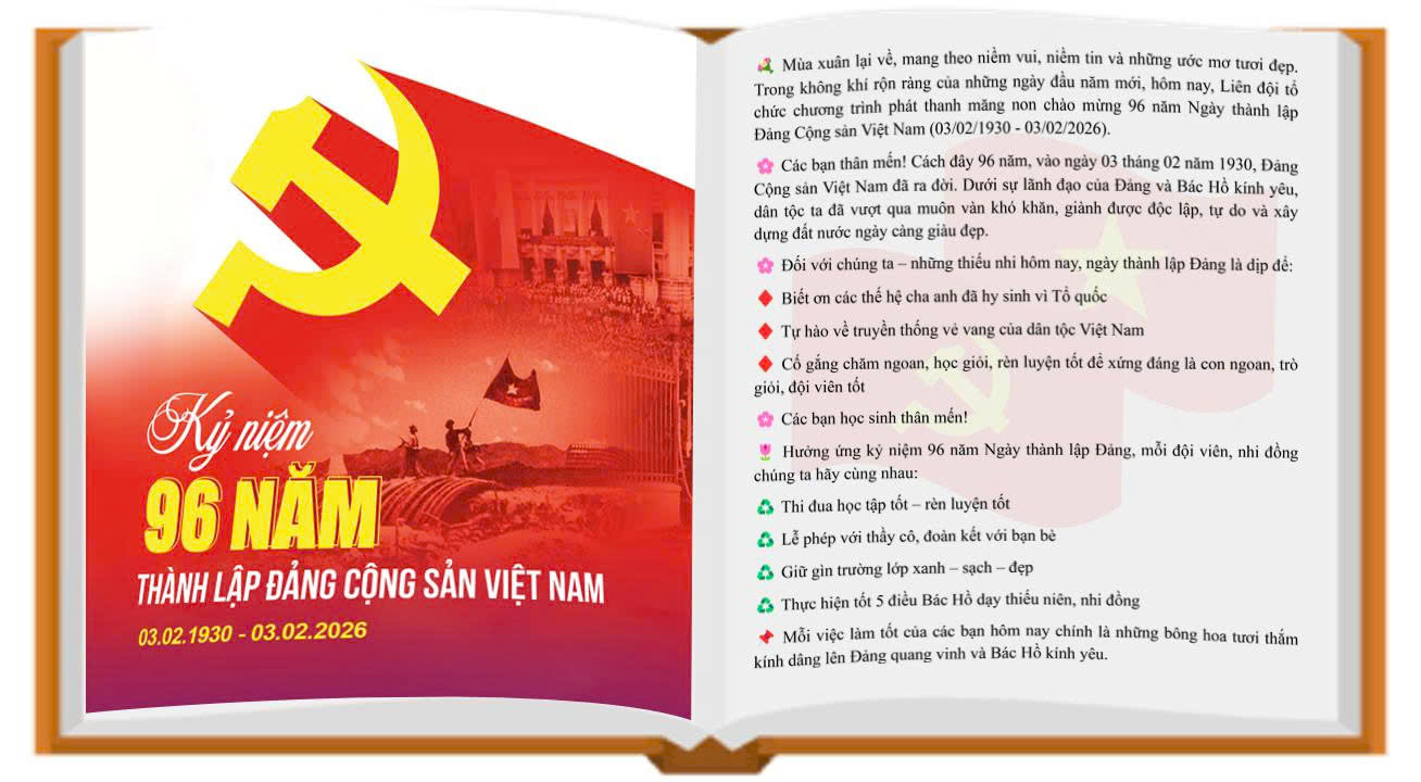 💐 Mùa xuân lại về, mang theo niềm vui, niềm tin và những ước mơ tươi đẹp. Trong không khí rộn ràng của những ngày đầu năm mới, hôm nay, Liên đội tổ chức chương trình phát thanh măng non chào mừng 96 năm Ngày thành lập Đảng Cộng sản Việt Nam (03/02/1930 - 03/02/2026).