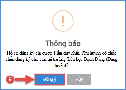 Bước 6: Hệ thống đưa ra thông báo, PHHS xác nhận [Đồng ý] để hoàn thành thao tác đăng ký tuyển sinh.