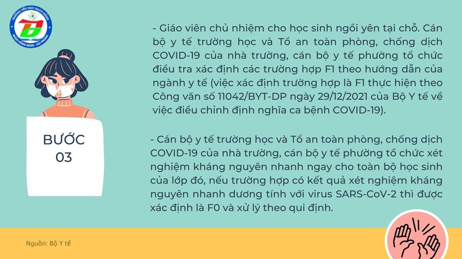 Dưới đây là quy trình xử trí khi phát hiện trường hợp mắc COVID-19 trong cơ sở giáo dục theo hướng dẫn của Bộ Y tế ngày 21/2/2022 gồm 4 bước: