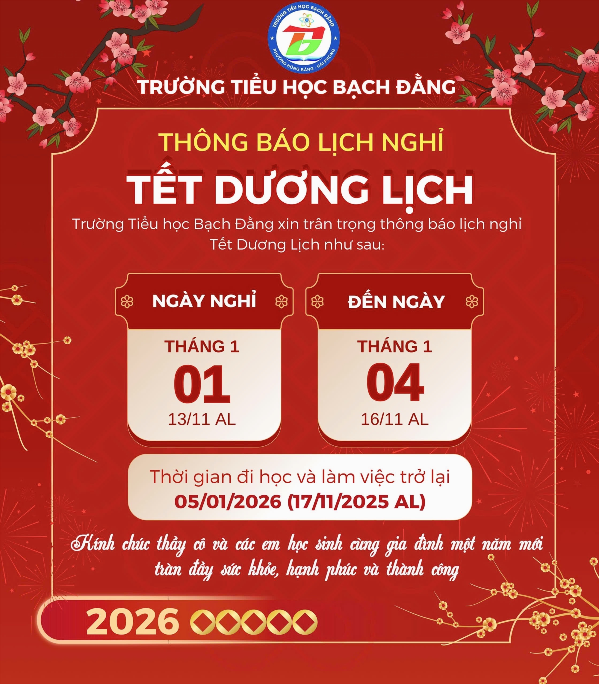Trường Tiểu học Bạch Đằng thông báo lịch nghỉ Tết Dương Lịch cụ thể như sau: