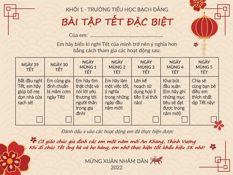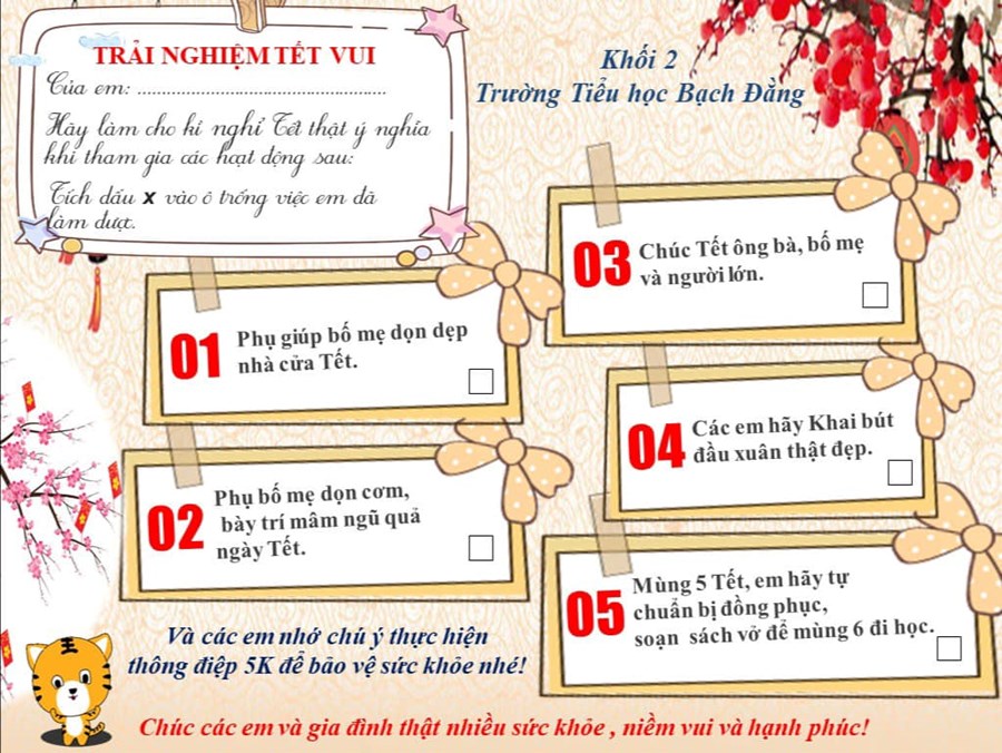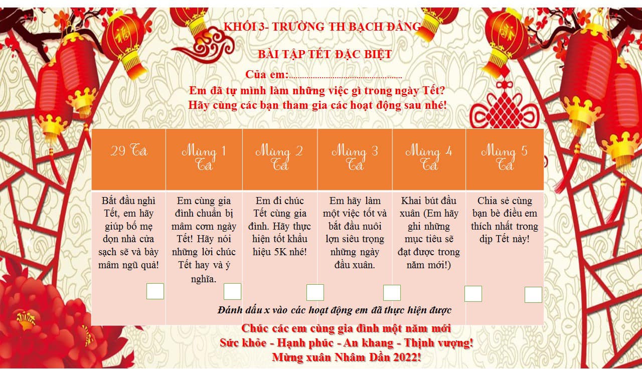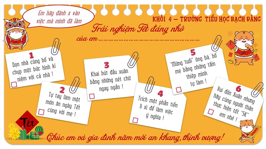 Các em thân mến, chỉ còn 3 ngày nữa, chúng ta sẽ nói lời chào tạm biệt năm Tân Sửu và chào đón năm mới Nhâm Dần. Các thầy cô và các em học sinh Trường Tiểu học Bạch Đằng đã trải qua một năm 2021 với những những thử thách đáng nhớ. Ngày Tết luôn là trải nghiệm đặc biệt đối với mỗi chúng ta. Trước thềm năm mới, chúng mình hãy cùng lên kế hoạch làm những việc thật ý nghĩa trong những ngày sắp tới nhé!